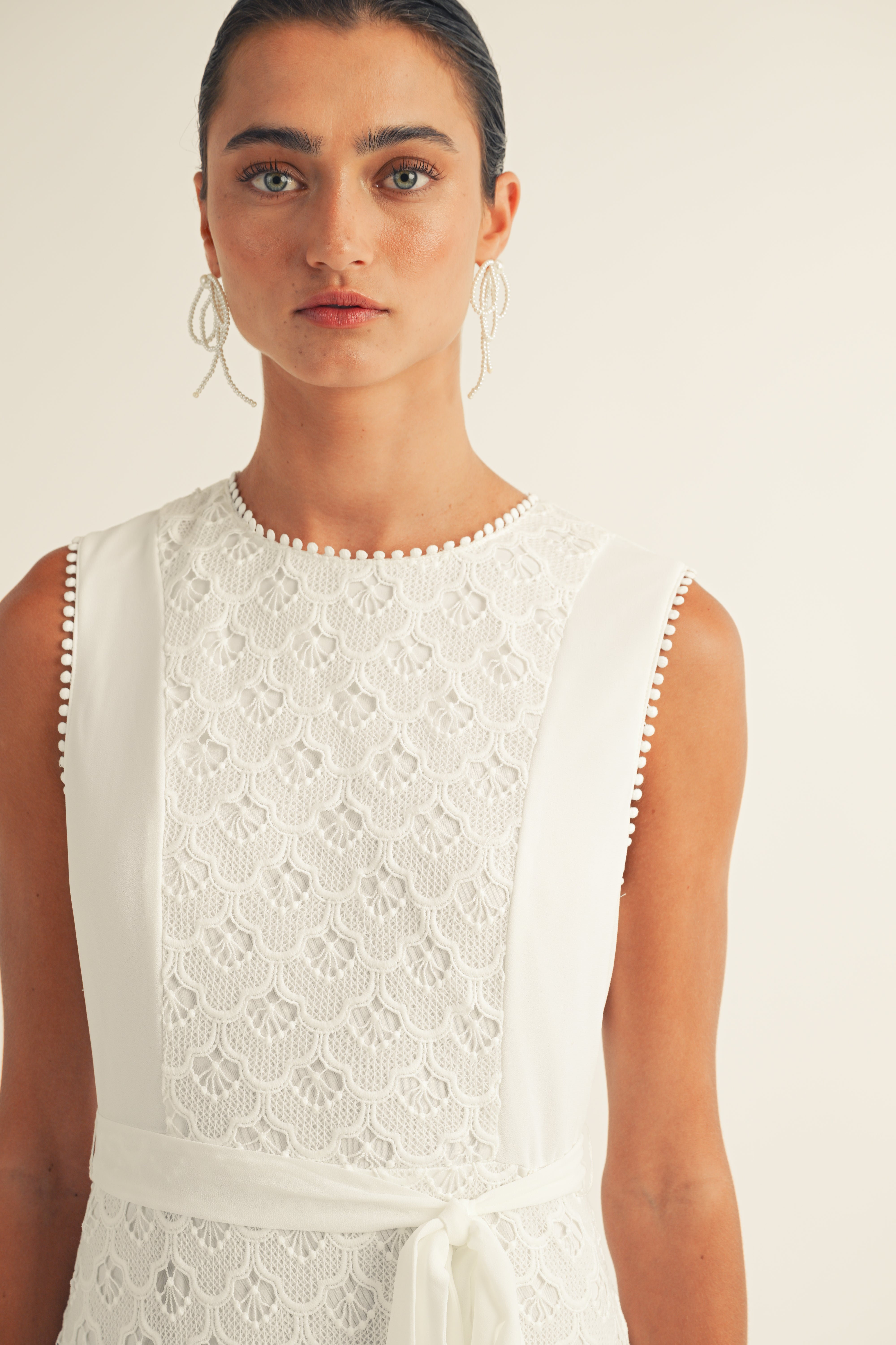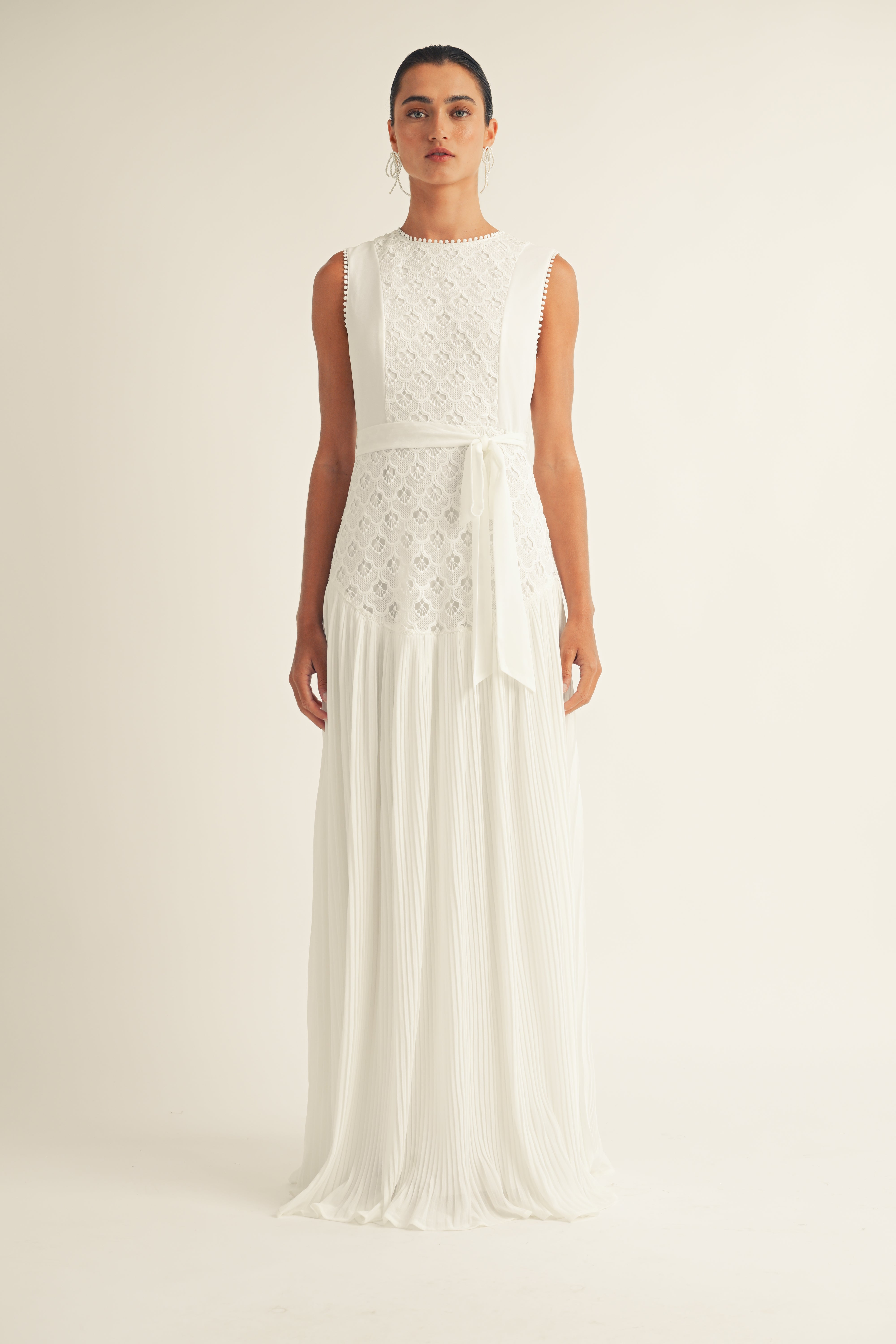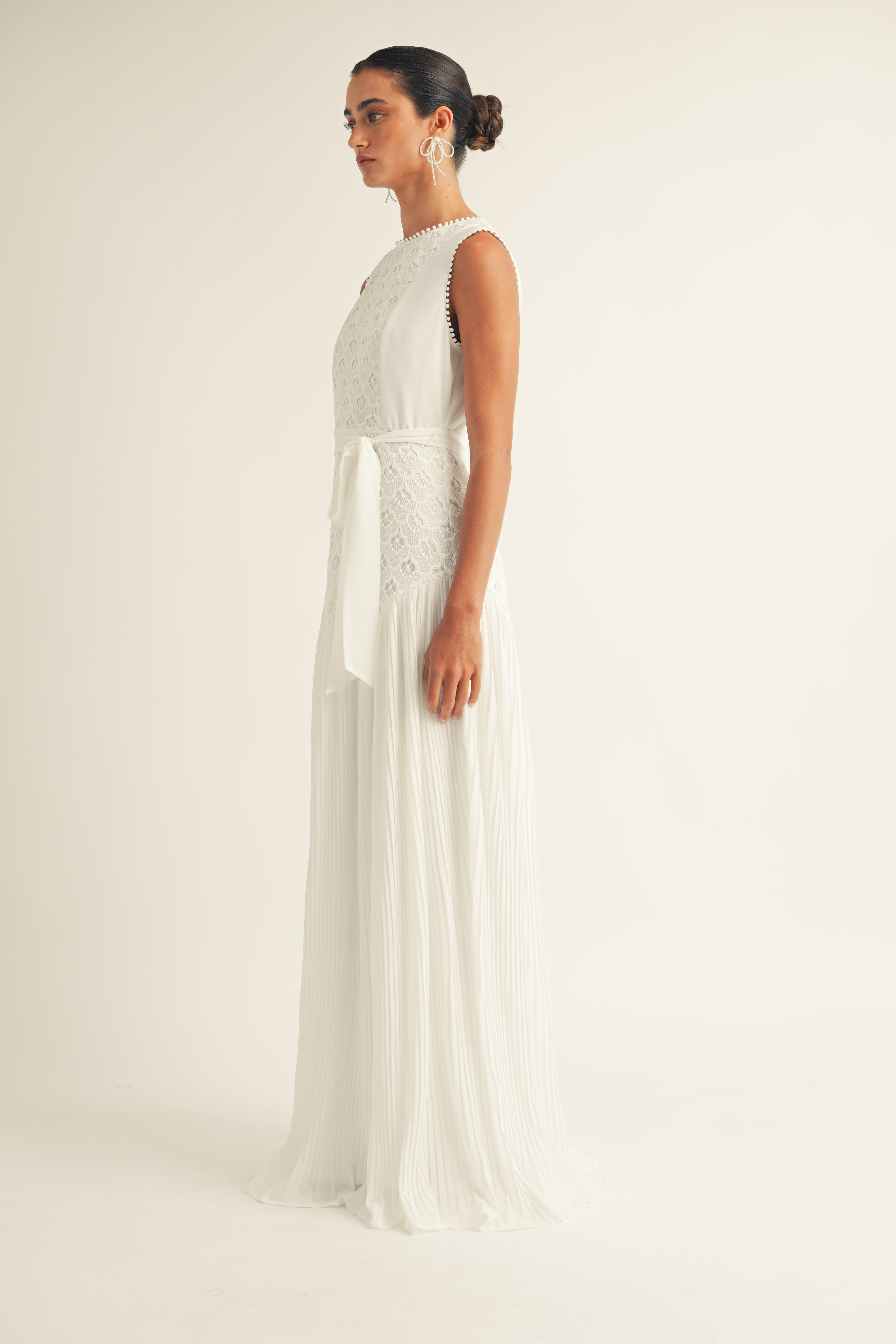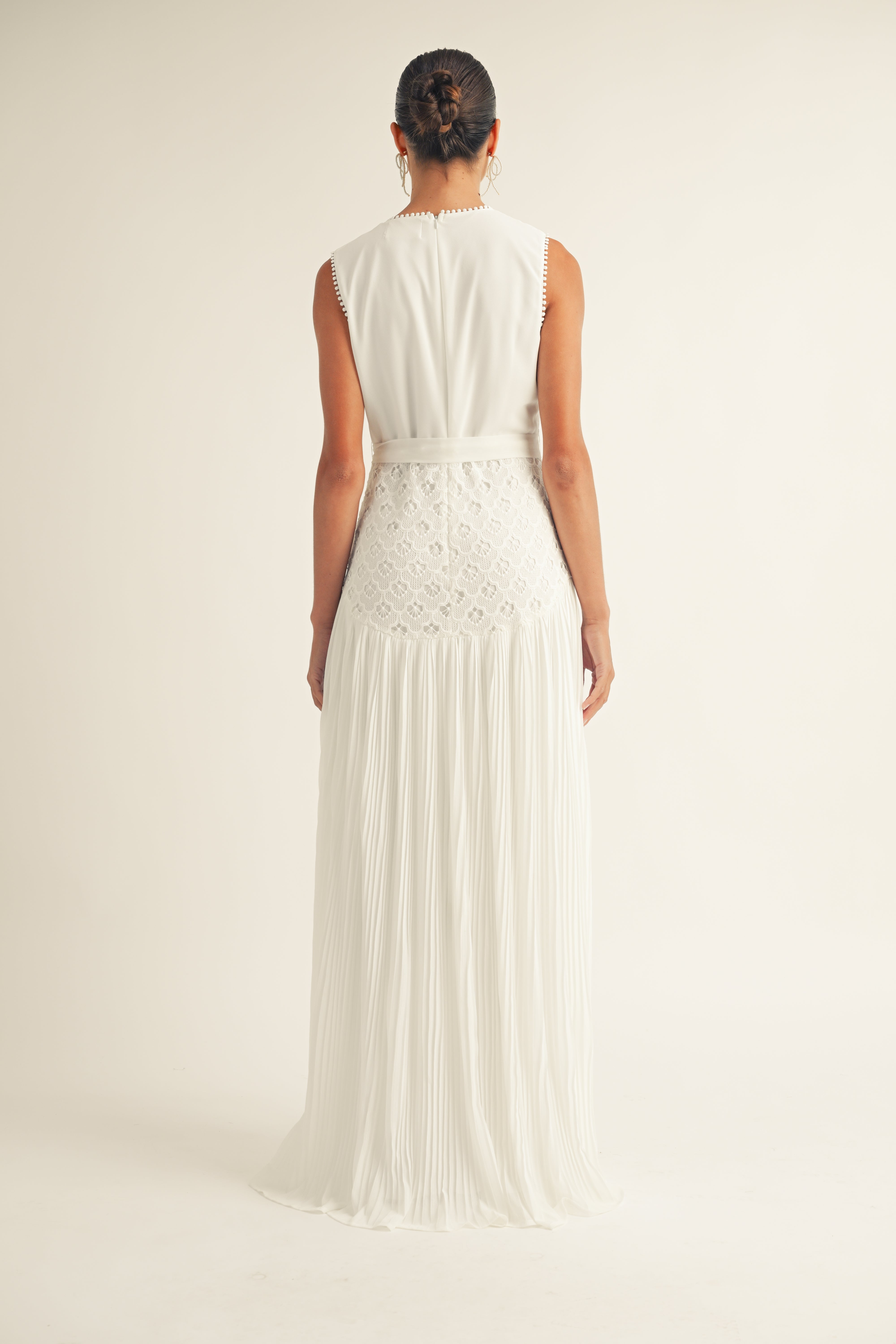 The Allison dress features a sleeveless design with lace contrast and a drop pleat maxi dress silhouette. Its elegant and sophisticated design will make you stand out at any event. Made with high-quality materials, this dress offers both comfort and style. Perfect for any special occasion.