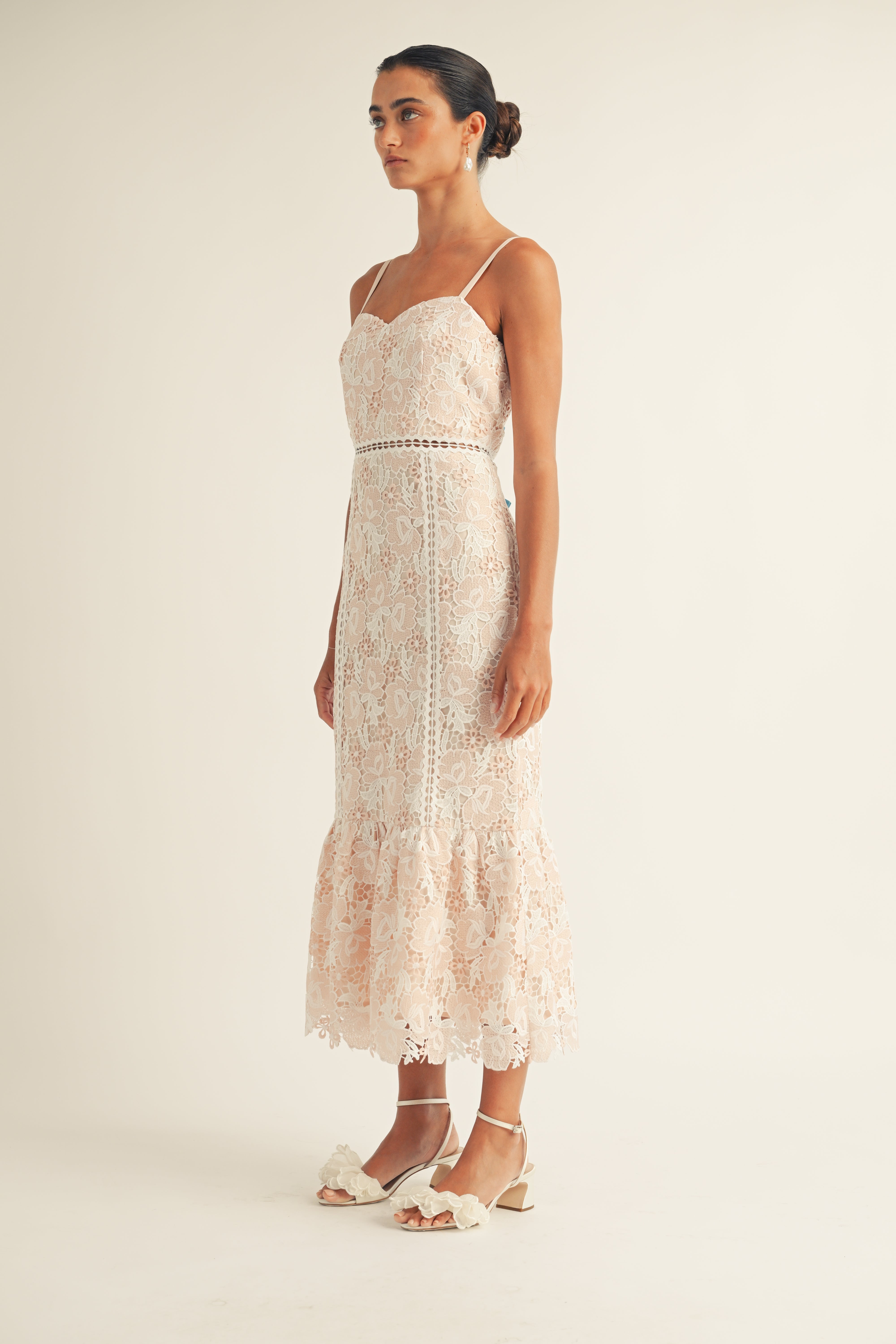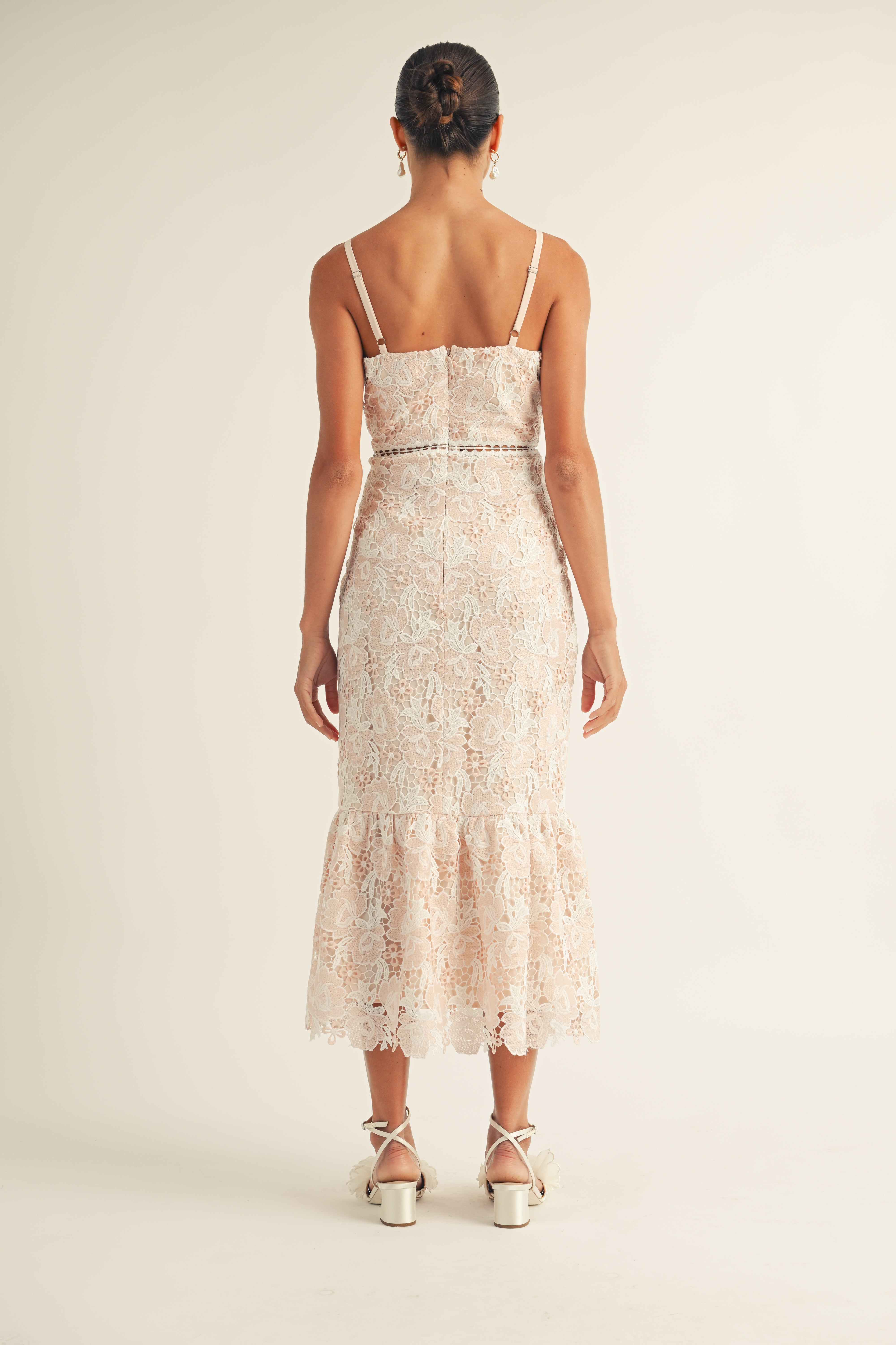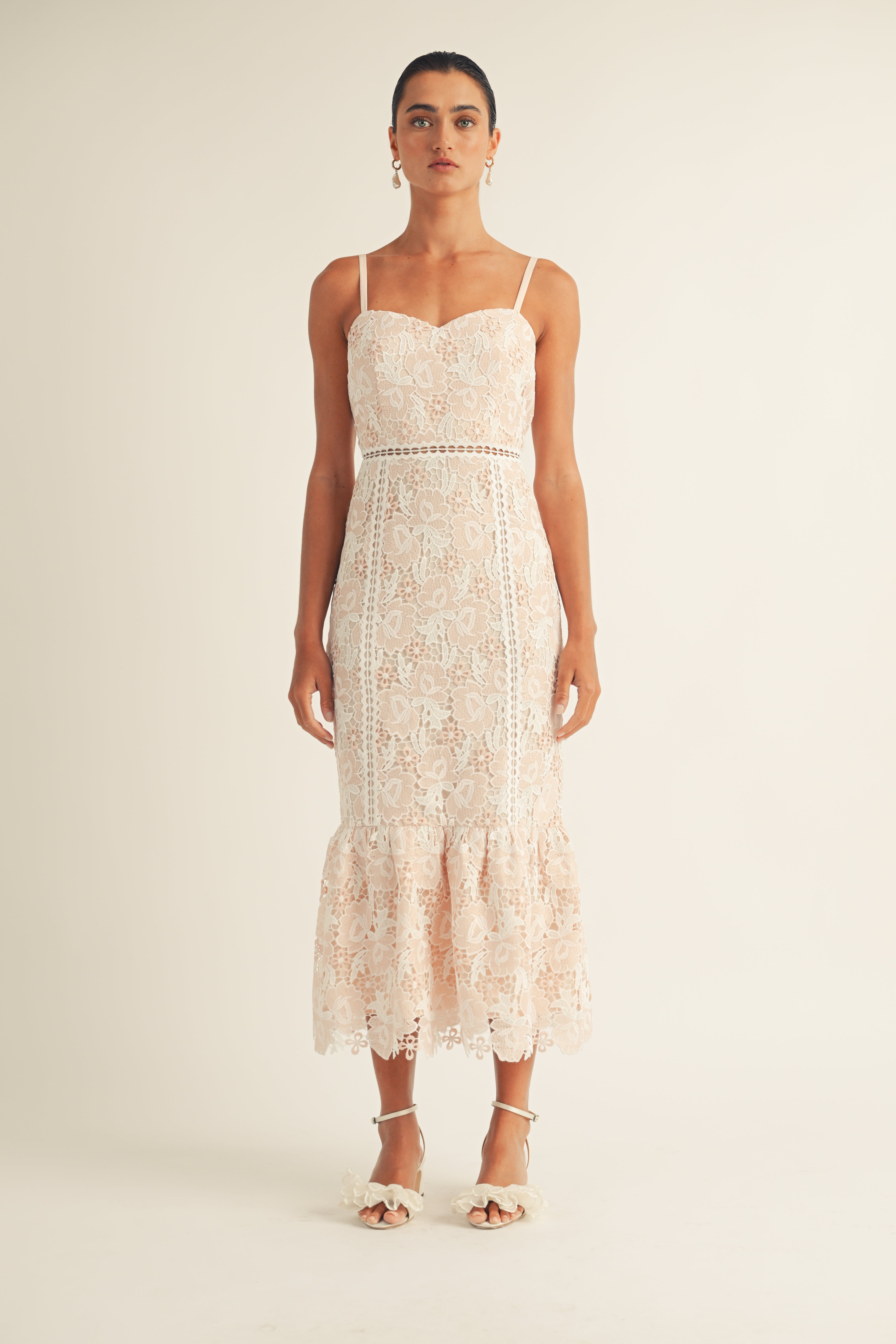 The Jenna dress features a flattering sweetheart neckline and delicate spaghetti straps, perfect for any spring event. The beautiful floral lace adds a touch of elegance, while the midi length provides a classic and timeless look.